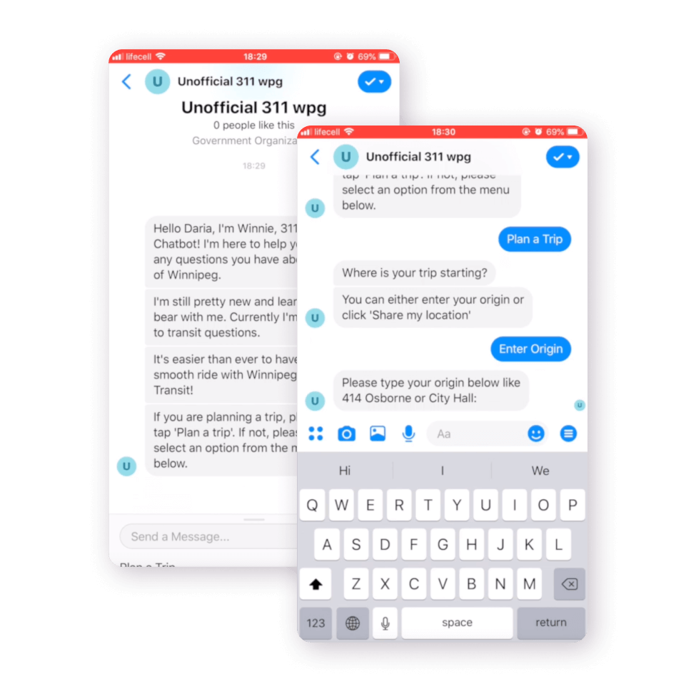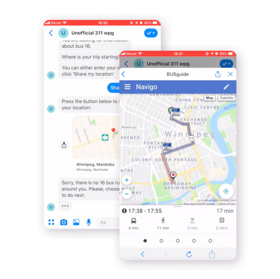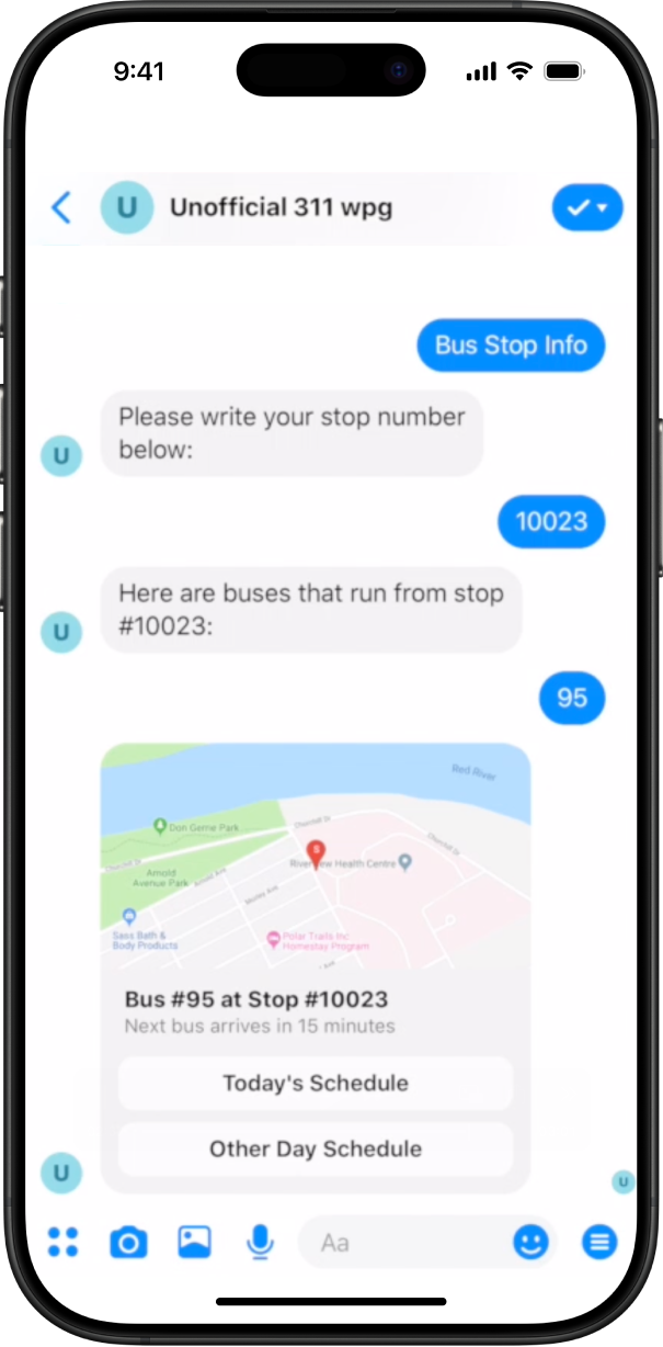 Integrated with the Winnipeg Transit API, the chatbot allows users to plan trips using a conversational interface. They can search for bus routes, find real-time bus locations, and see upcoming schedules – all within the familiar environment of Facebook Messenger.